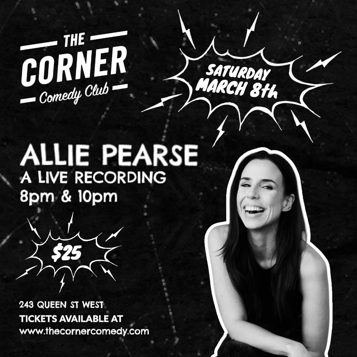 Come laugh out loud with one of the funniest comics in the biz! Allie Pearse, known for her sharp wit and hilarious takes, is recording her very own special LIVE! Get ready to enjoy Allieβs unique comedy style, along with some special guest comedians who have rocked stages across Just For Laughs, Netflix, CRAVE, and more.